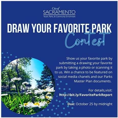 The City of Sacramento has a few more ways to give input to the Master Plan – draw your favorite park and add a photo of your favorite. There are Prizes! It’s quick and easy so if you haven’t participated yet get your entry in!