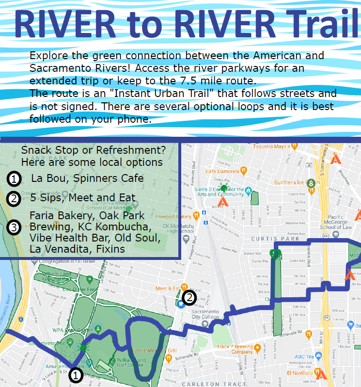 We selected this route (along with some snack spots) to help you explore this connection and your city. If you have ideas for additional instant urban trails we would love to help you develop them – we think there is potential along Arcade Creek, Morrison and Florin Creeks, and many other areas of Sacramento.