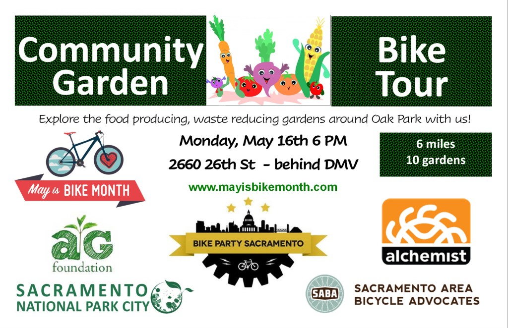 Biking is one of the best ways to explore the city! May is packed with events and you should sign up at May is Bike Month! If you don’t have a team already join our SacParkCity Team! We’re hosting an event May 16 at Gateway Garden where we tour the community created gardens of Oak Park with Bike Party – check out the flyer below.